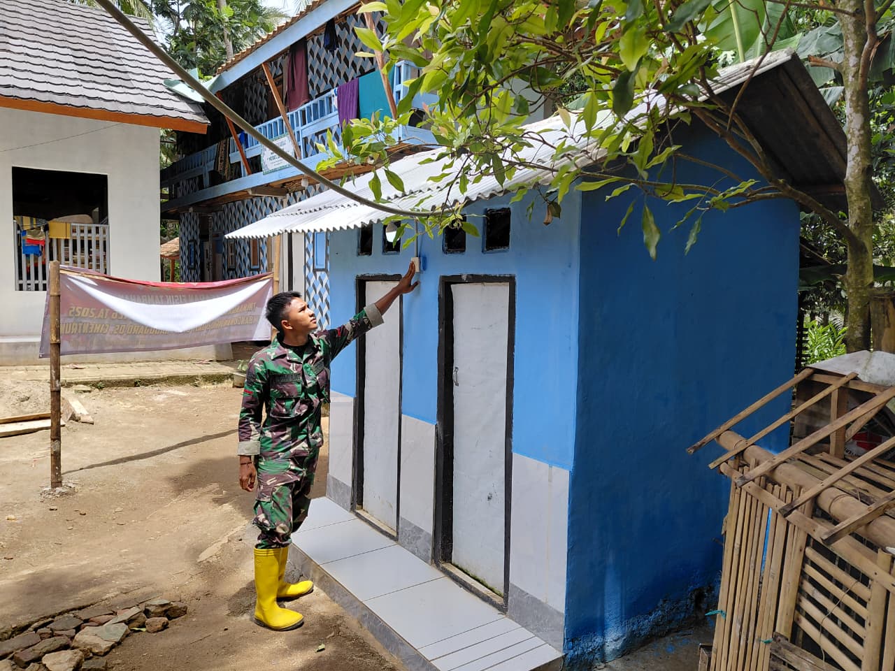 Dalam foto terlihat salah satu anggota Satgas TMMD sedang melakukan pengecekan hasil akhir bangunan MCK yang telah berdiri kokoh dan rapi. Pengecekan ini dilakukan sebagai bagian dari proses pengawasan kualitas bangunan agar hasil kerja dapat dimanfaatkan dengan baik oleh masyarakat.