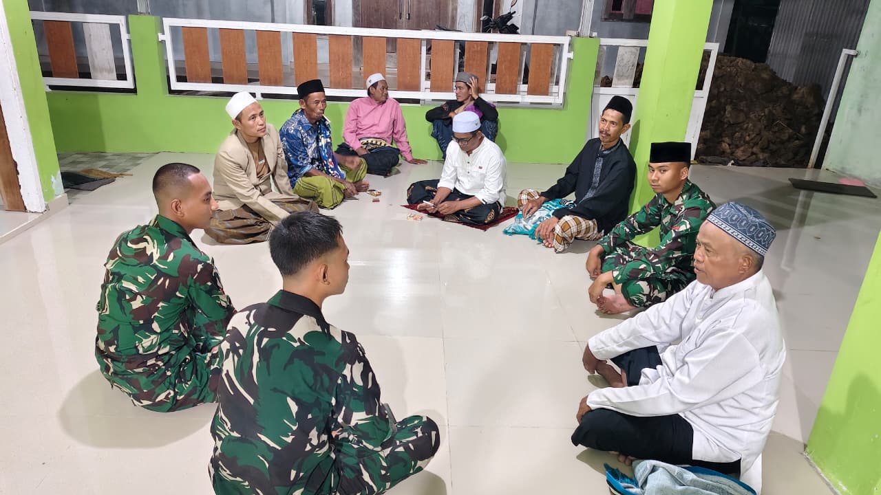 Para personel Satgas TMMD nampak duduk melingkar dan berbincang hangat dengan Tokoh Agama (Toga) setempat, Bapak Abdul Hamid (65), yang juga menjabat sebagai Ketua Ta’mir Mushola Riyadhul Huda.
