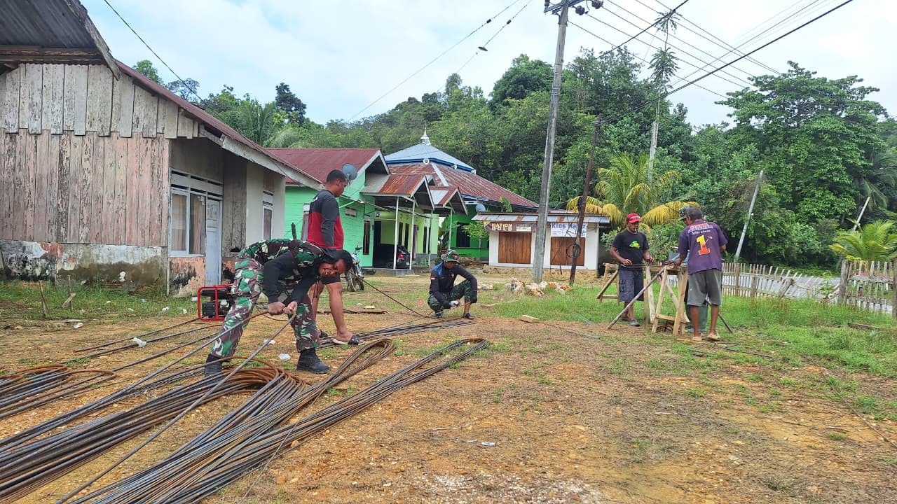 Dalam sebuah momen penuh kebersamaan, personel Satgas TMMD bersama warga setempat tampak kompak mengerjakan perakitan besi tulangan untuk pembangunan infrastruktur desa.