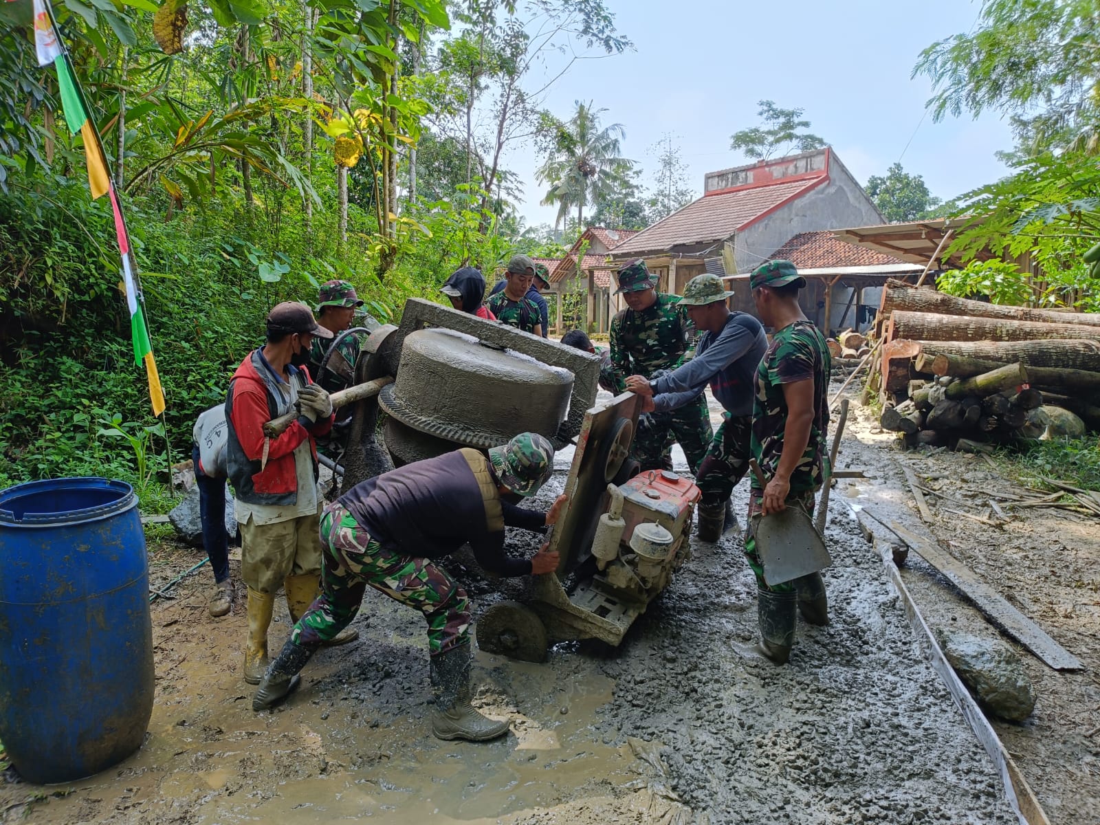 Cangkul menghentak tanah, molen berputar tanpa henti, dan adukan semen dituang dengan sigap ke badan jalan. Anggota Satgas TMMD berpacu dengan bayang-bayang hujan, memastikan pengecoran rabat beton rampung sebelum langit benar-benar menumpahkan isinya.