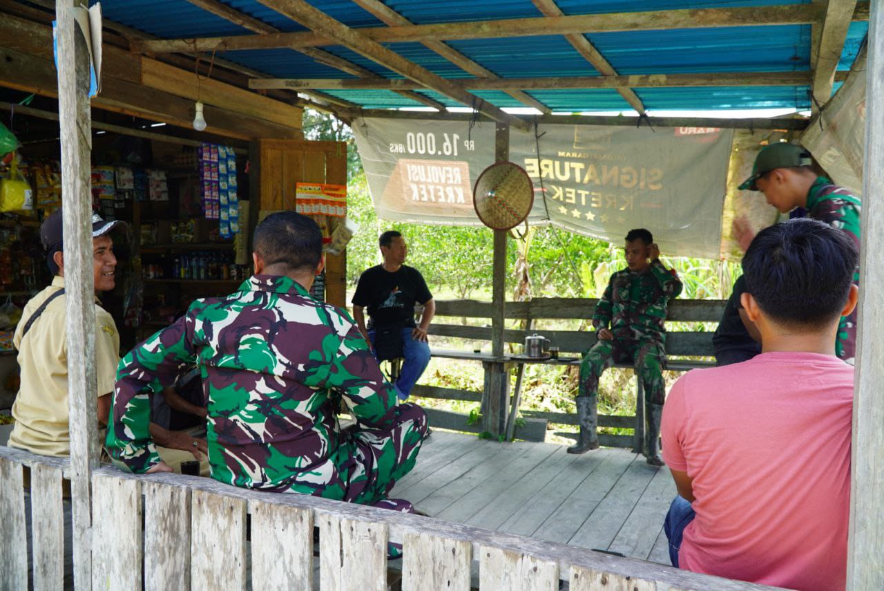Sambas – Komandan Satuan Tugas (Dansatgas) TMMD Ke-126 Kodim 1208/Sambas meluangkan waktu untuk berkomunikasi sosial (Komsos) bersama Kepala Desa Ratu Sepudak (Muhkart) di sebuah warung sembako milik warga setempat.