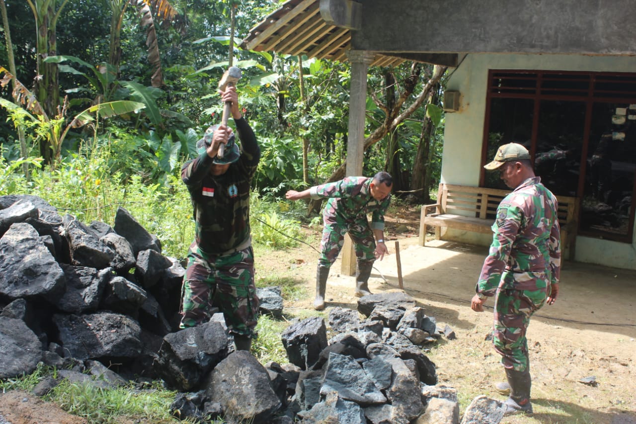 Kebumen – Di tengah semangat pembangunan TMMD Reguler ke-127 Kodim 0709/Kebumen di Desa Somagede, tampak sosok Sertu Nawawi berdiri tegap di antara tumpukan batu. Dengan palu di tangannya, ia memecah batu demi batu yang akan digunakan sebagai material pembangunan gorong-gorong.