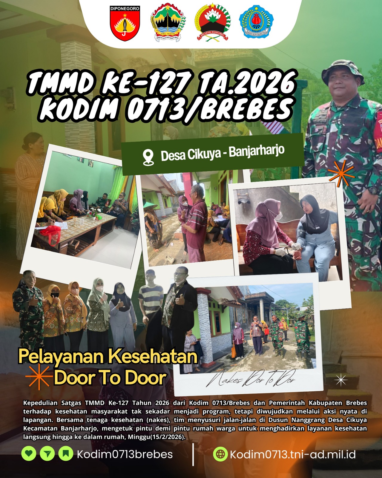 BREBES – Kepedulian Satgas TMMD Ke-127 Tahun 2026 dari Kodim 0713/Brebes dan Pemerintah Kabupaten Brebes terhadap kesehatan masyarakat tak sekadar menjadi program, tetapi diwujudkan melalui aksi nyata di lapangan. Bersama tenaga kesehatan (nakes), tim menyusuri jalan-jalan di Dusun Nanggrang Desa Cikuya Kecamatan Banjarharjo, mengetuk pintu demi pintu rumah warga untuk menghadirkan layanan kesehatan langsung hingga ke dalam rumah, Minggu(15/2/2026).