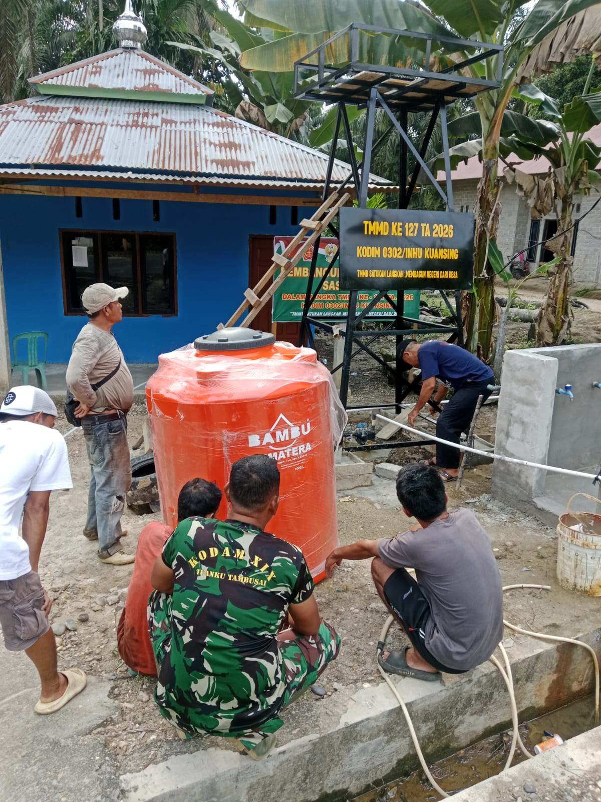 Kegiatan ini merupakan bagian dari program TMMD (Tugas Pembangunan Masyarakat) Ke-127 yang digagas oleh Kodim 0302/Indragiri Hulu (Inhu). Pemasangan tanki penampungan menjadi langkah krusial untuk memastikan air yang diambil dari sumur bor dapat disimpan dan digunakan secara optimal oleh masyarakat sekitar mushala.