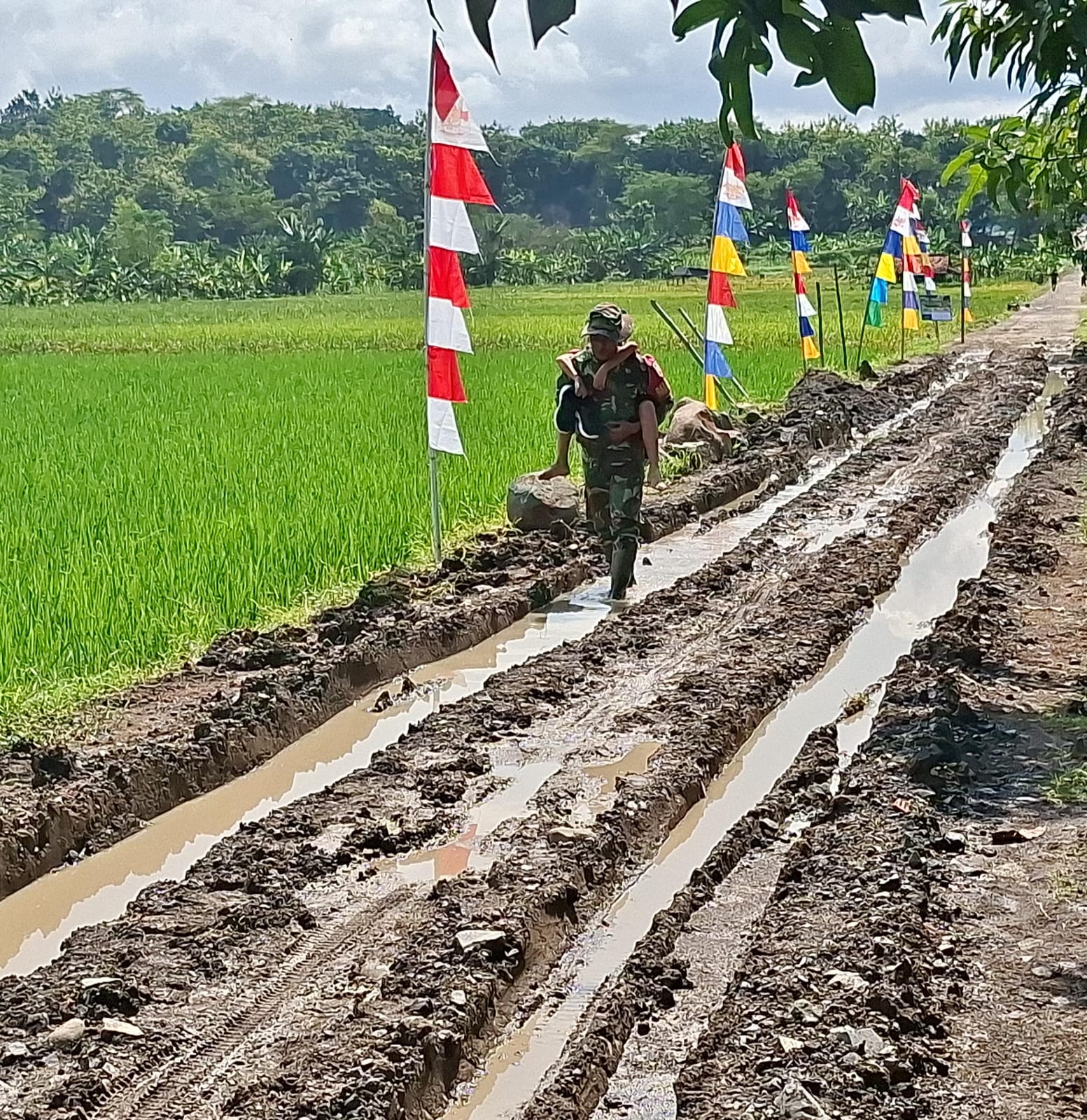 Melihat perjuangan para siswa tersebut, Serda Nanang tidak tinggal diam. Ia secara sukarela menggendong satu per satu siswa melewati titik-titik jalan yang paling parah kondisinya.