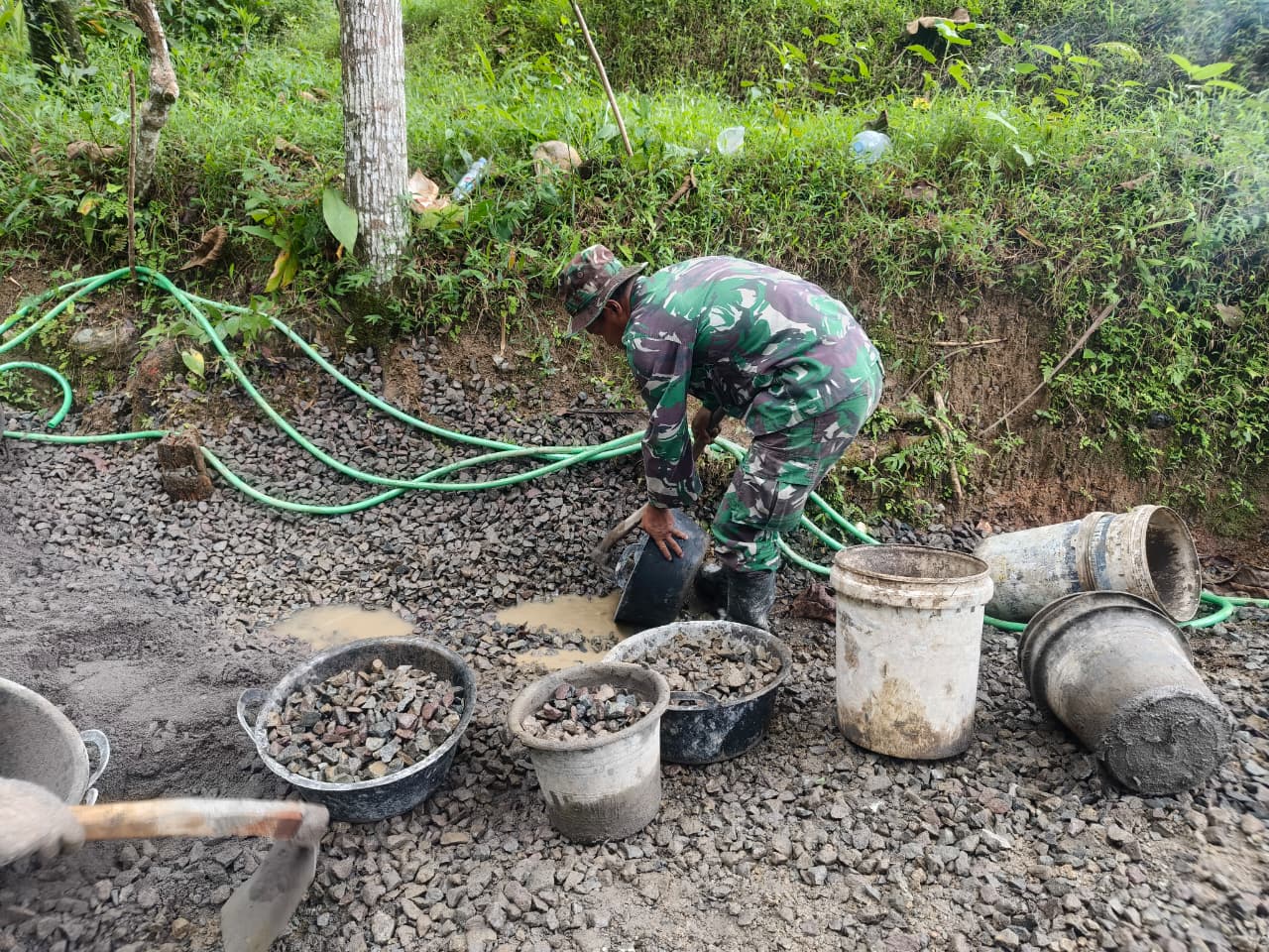 Meski langit tampak muram dan tanah mulai lembap, para prajurit dan warga bahu-membahu melanjutkan pekerjaan. Cangkul terus bergerak, adukan semen tetap diputar, dan semangat gotong royong justru semakin terasa hangat di tengah dinginnya cuaca.