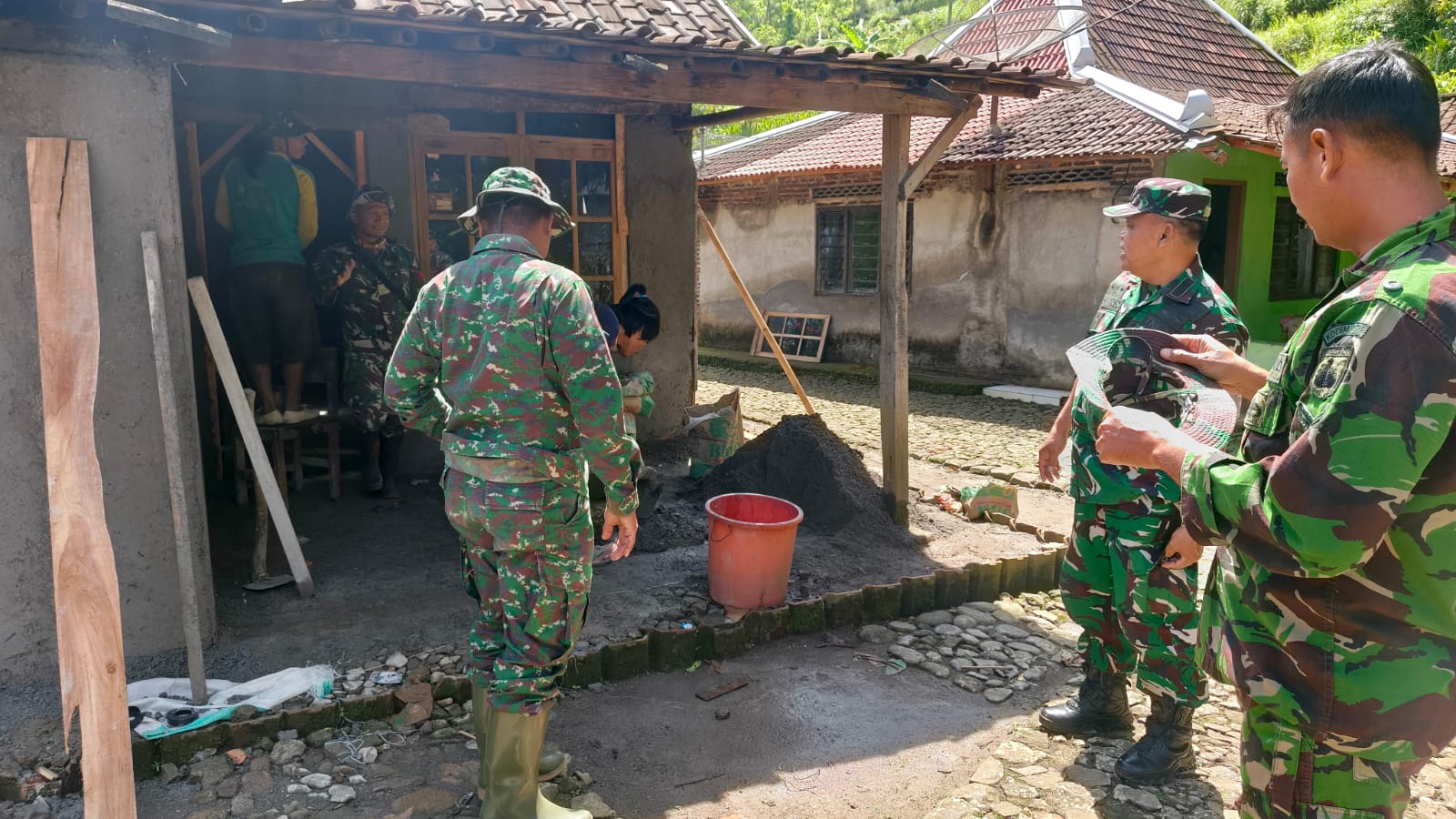 Ia memantau setiap detail pekerjaan, mulai dari pengadukan material hingga proses perapian dinding. Kehadiran perwira pengawas ini menjadi penyemangat tersendiri bagi anggota satgas dan masyarakat yang terlibat.