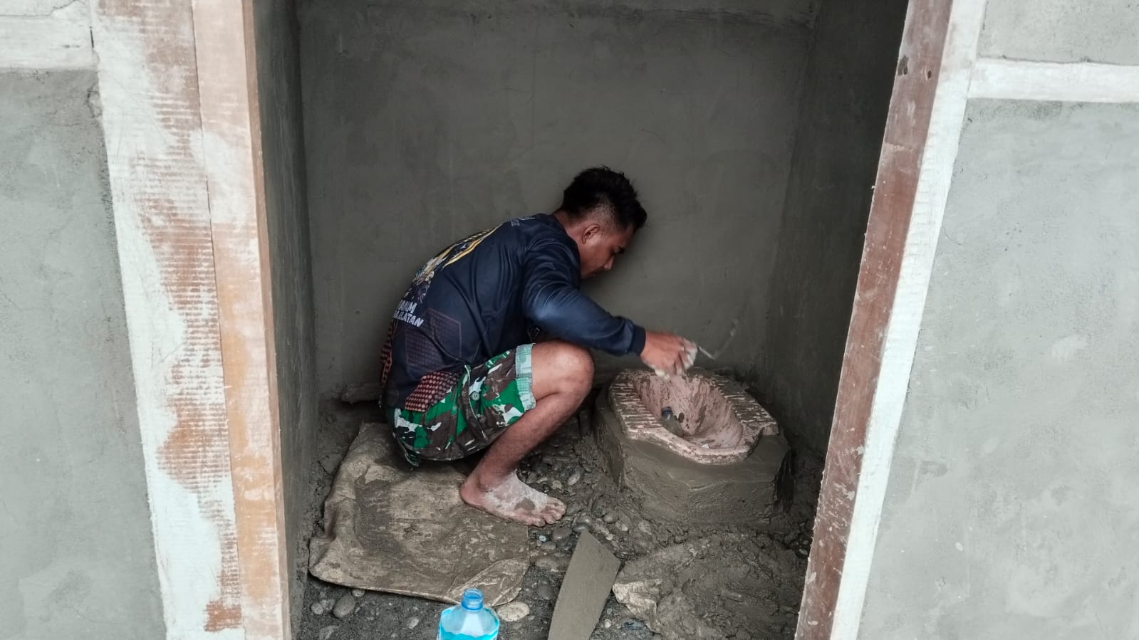 Anggota Satgas TMMD dan warga yang terlibat dalam gotong royong tampak fokus melakukan pemasangan kloset jongkok dan merapikan adukan semen. Pekerjaan detail ini menjadi tahap akhir sebelum MCK dapat difungsikan sepenuhnya oleh masyarakat.