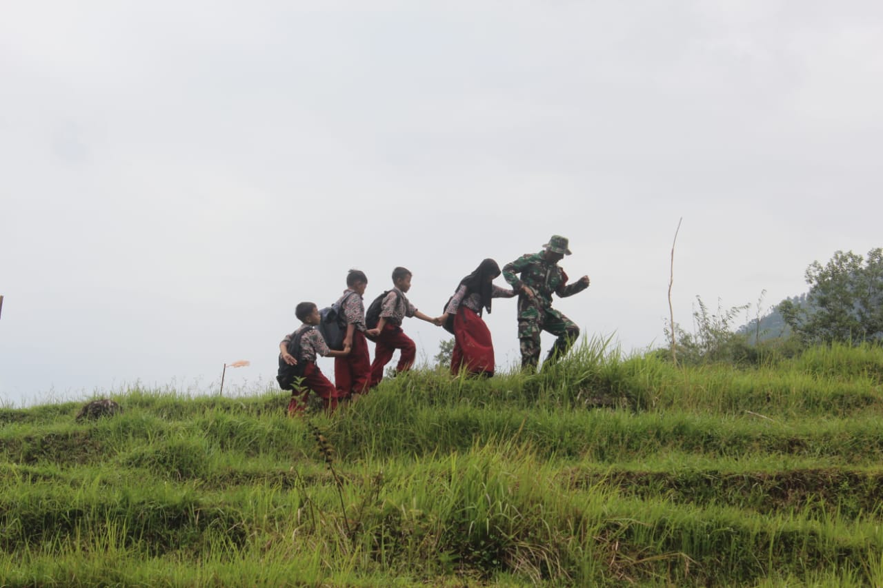 Dengan senyum ramah, Serma Suparlan menyapa satu per satu anak yang pulang sekolah. Ia tak hanya menanyakan pelajaran mereka, tetapi juga memberi motivasi agar rajin belajar dan berani bercita-cita tinggi. Kehangatan itu membuat anak-anak tampak antusias dan tidak canggung.