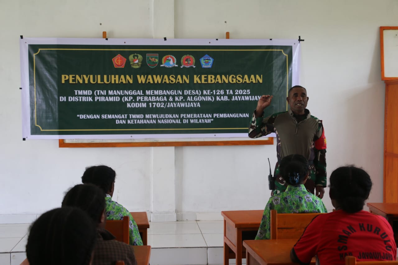 Wamena – dengan semangat membangun generasi muda yang cinta tanah air, Satuan Tugas TNI Manunggal Membangun Desa (TMMD) ke-126 Kodim 1702/Jayawijaya melaksanakan kegiatan penyuluhan Wawasan Kebangsaan kepada para siswa-siswi di wilayah Papua Pegunungan, Rabu (15/10/2025).
