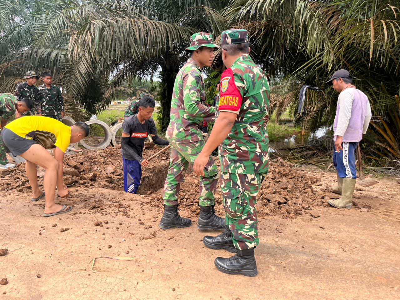 Di lokasi pemasangan gorong-gorong, Kasdim 0430/BA melihat langsung proses pemasangan dan memastikan pekerjaan dilakukan sesuai dengan standar yang telah ditetapkan. Ia juga berinteraksi dengan anggota Satgas TMMD dan masyarakat yang terlibat dalam pekerjaan tersebut.