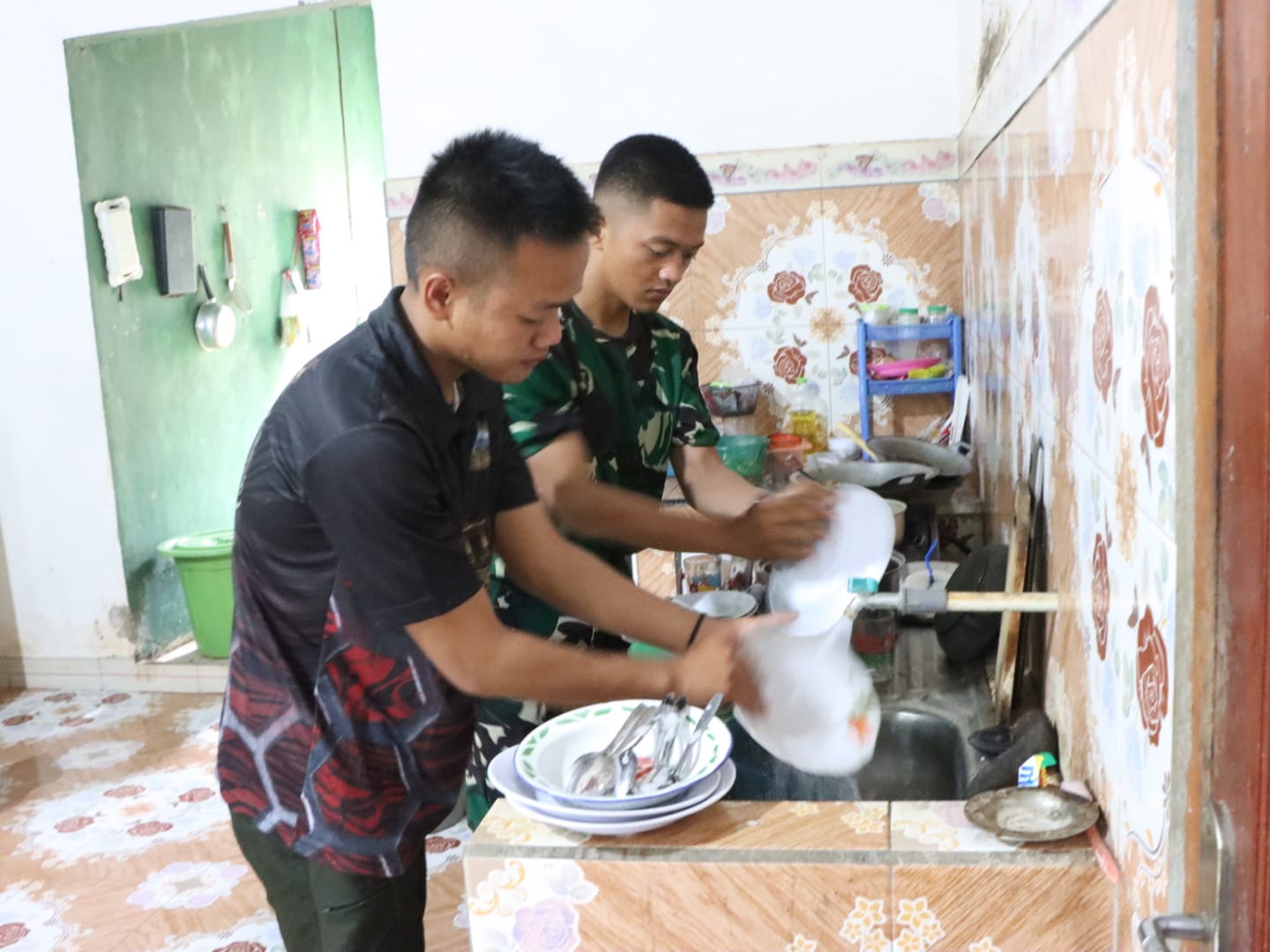 BANYUASIN– Kedekatan anggota Satuan Tugas (Satgas) TNI Manunggal Membangun Desa (TMMD) ke-127 Kodim 0430/Banyuasin (BA) dengan keluarga asuh di titik sasaran TMMD semakin terlihat nyata. Salah satu contohnya adalah ketika anggota Satgas dengan sukarela membantu mencuci piring di rumah keluarga asuh.