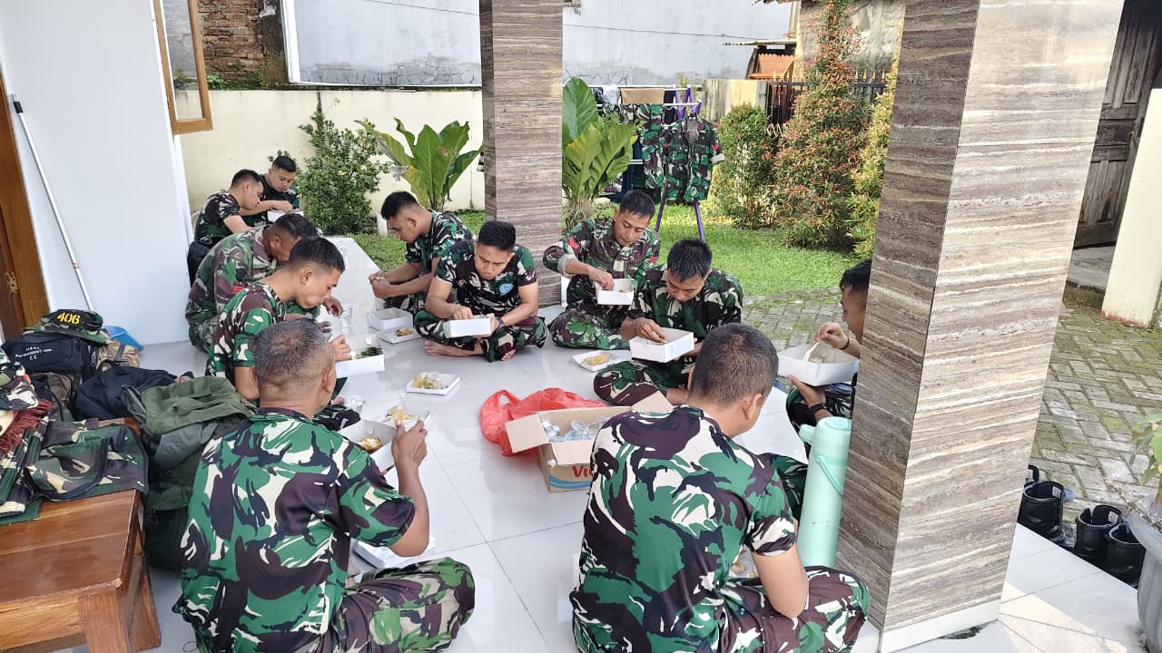 Tampak terlihat para anggota Satgas sedang sarapan pagi di rumah bapak Miftahul (35) yang satgas menginap.