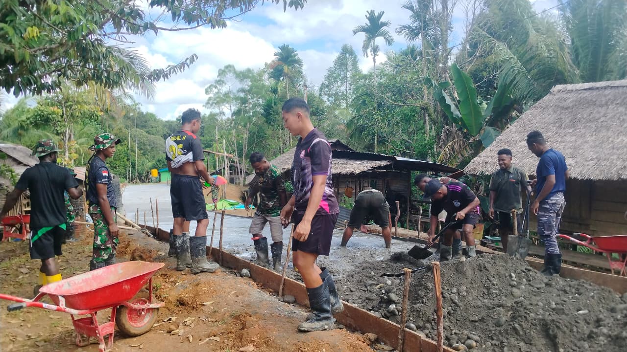 Kamis (23/10/2025), Dengan semangat gotong royong, personel TNI bersama masyarakat setempat bahu-membahu melaksanakan pengecoran meskipun dihadapkan pada kondisi cuaca yang tidak menentu. Upaya percepatan ini dilakukan agar hasil pembangunan dapat segera dimanfaatkan oleh warga.