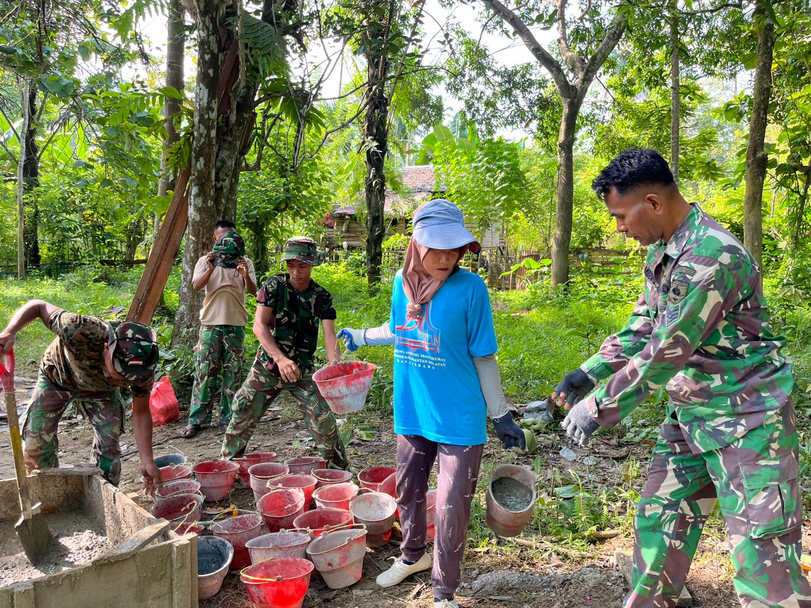 Semangat gotong royong antara personel TNI dan warga setempat menjadi energi utama dalam mengejar target pembangunan yang telah direncanakan.