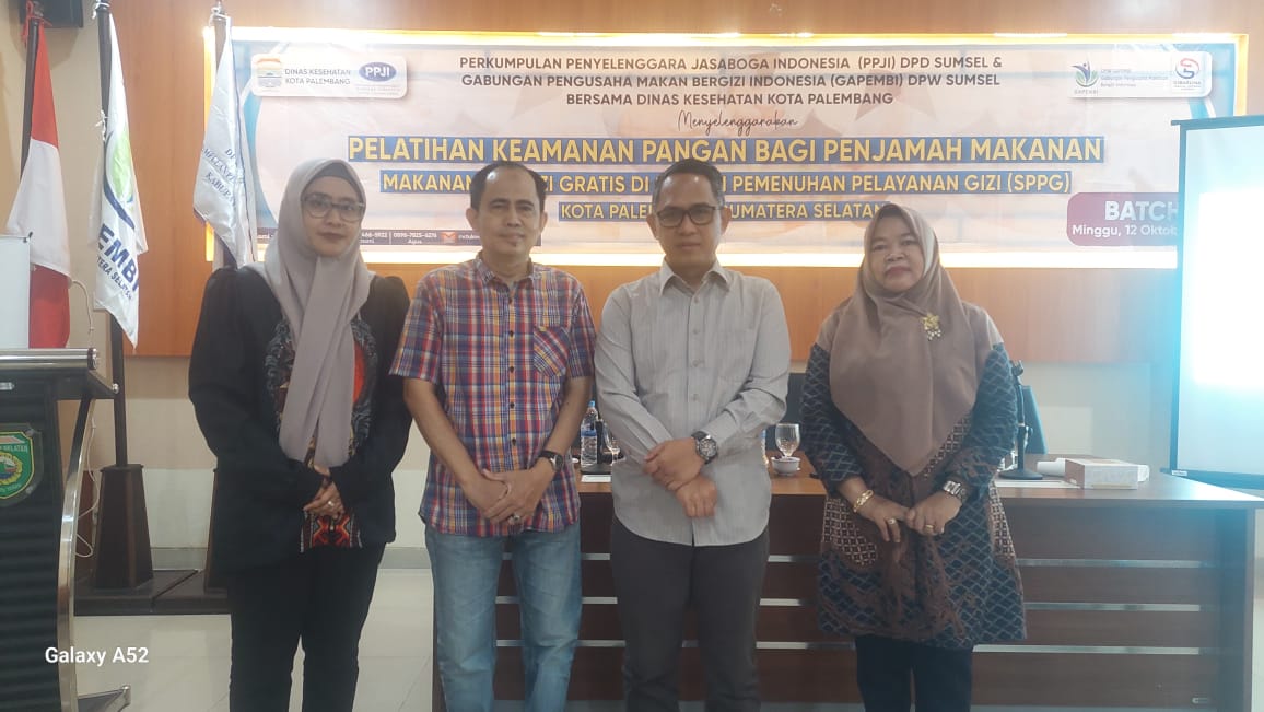 PALEMBANG – Gabungan Pengusaha Makan Bergizi Indonesia (GAPEMBI) DPD Sumsel, bersama Perkumpulan Penyelenggara Jasaboga Indonesia (PPJI) DPD Sumsel, Minggu, 12 Oktober 2025, kembali menggelar Pelatihan Keamanan Pangan Bagi Penjamah Makanan MBG (Makanan Bergizi Gratis) di Satuan Pelayanan Pemenuhan Gizi (SPPG).