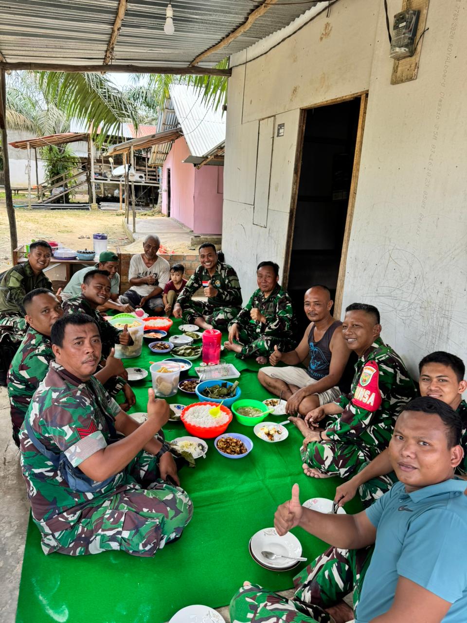Momen santap siang bersama ini berlangsung sederhana namun hangat di salah satu sudut lokasi TMMD. Dansatgas dan personel duduk bersila, berbagi hidangan, sambil berbincang santai. Kehadiran Dansatgas di tengah-tengah prajurit menunjukkan kepemimpinan yang dekat dan merakyat.