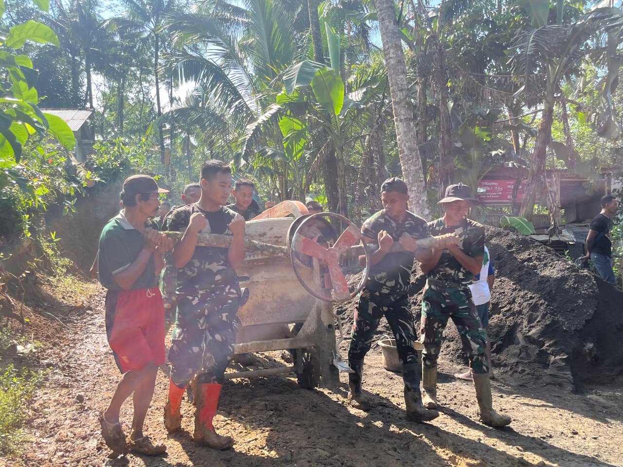 Terik matahari yang mulai meninggi berpadu dengan kondisi tanah yang licin usai diguyur hujan. Namun, hal itu tak menyurutkan langkah para personel TNI dan warga. Bahkan, untuk memindahkan alat berat seperti mesin molen ke titik pengecoran, mereka harus mengangkatnya secara bersama-sama.