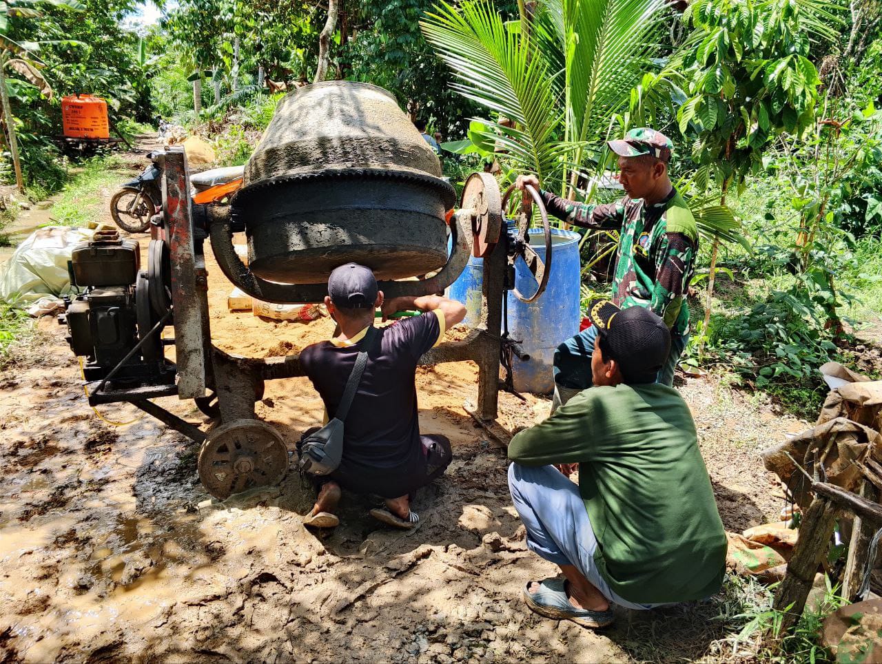Mesin molen yang digunakan untuk mencampur material cor sempat berhenti beroperasi akibat kendala teknis. Tanpa menunggu lama, anggota Satgas segera melakukan pengecekan dan perbaikan secara gotong royong agar pekerjaan dapat kembali berjalan sesuai target waktu yang telah ditentukan.