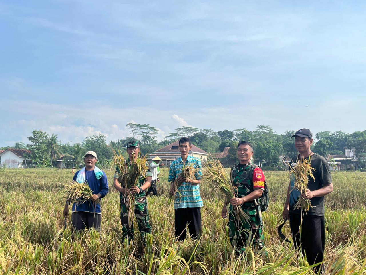 Tidak ada sekat antara seragam loreng ataupun pakaian petani, keduanya menyatu dalam satu irama untuk memanen bulir demi bulir padi yang telah menguning.