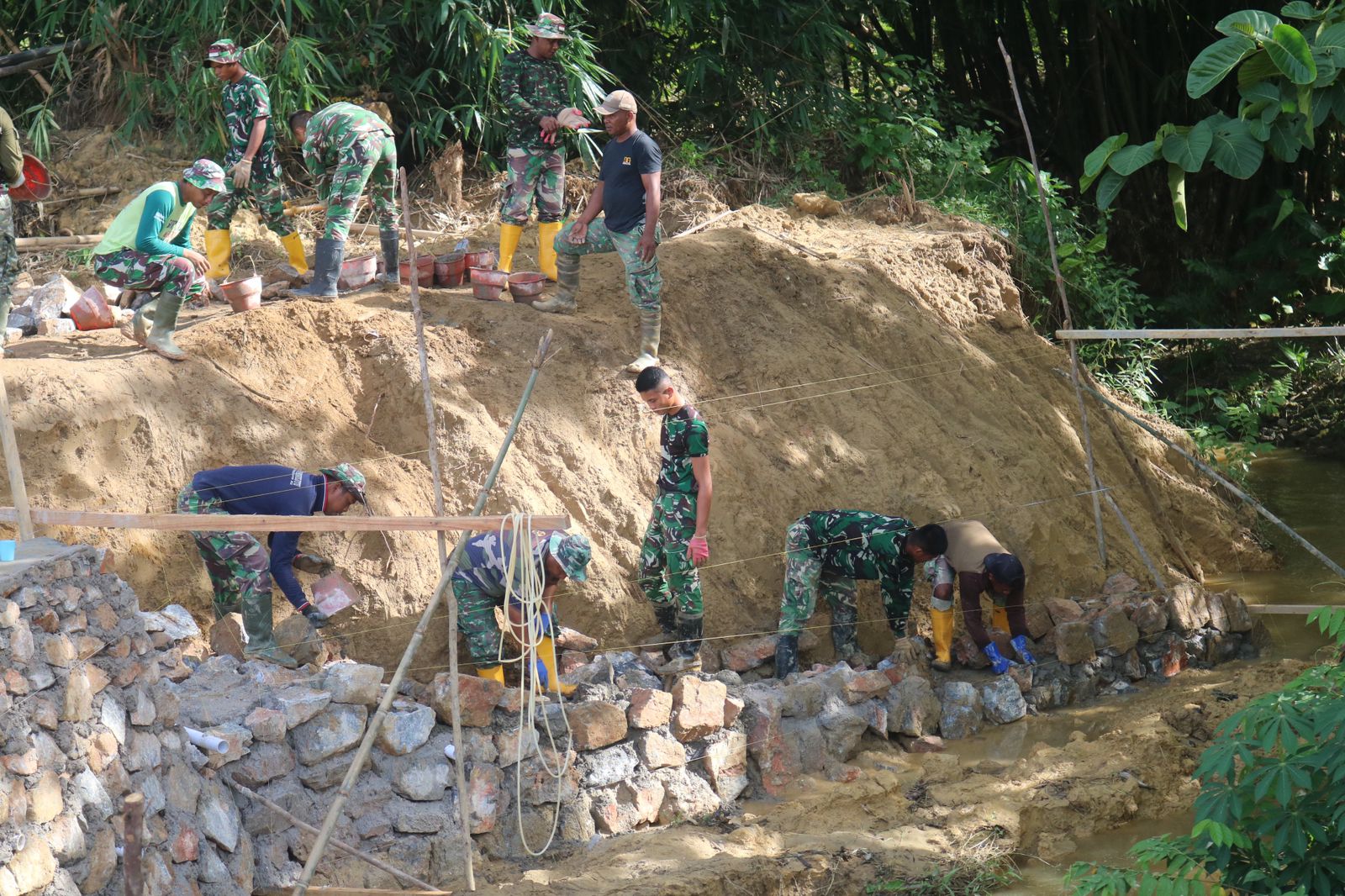 Semangat gotong royong ini menjadi kunci utama agar progres fisik pembangunan infrastruktur di wilayah tersebut tetap berjalan sesuai jadwal yang telah ditentukan. Pembangunan talud jembatan ini merupakan salah satu sasaran fisik penting dalam program TMMD kali ini guna memperkuat struktur penyeberangan warga.