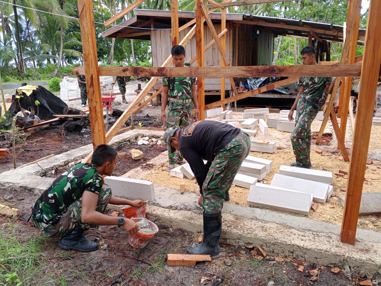 Kegiatan ini merupakan wujud nyata sinergi antara TNI dan masyarakat dalam upaya meningkatkan kesejahteraan serta memperbaiki fasilitas hunian di daerah. Di lokasi pembangunan, terlihat anggota TNI bekerja bahu-membahu dengan warga setempat, saling membantu dalam proses pemasangan bata menggunakan bahan bangunan yang telah disiapkan. Suasana kerja terlihat penuh semangat dan gotong royong, menunjukkan kekompakan antara aparat dan masyarakat.