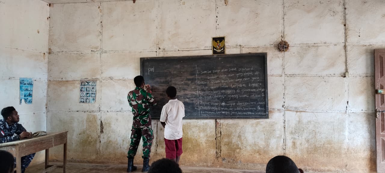Boven Digoel – Tentara Manunggal Membangun Desa (TMMD) ke-126 Kodim 1711/Boven Digoel, Dalam rangka menumbuhkan semangat nasionalisme dan rasa cinta tanah air, Personel Satgas TNI Manunggal Membangun Desa (TMMD) ke-126 Serda Thonci Windesy memberikan materi wawasan kebangsaan kepada siswa – siswi DI SD YPPK St Isidorus Waropko.