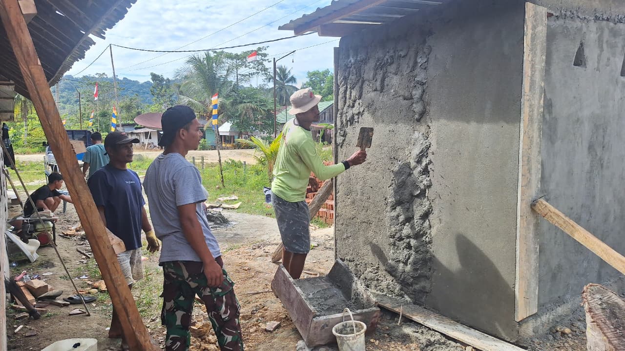 Dengan penuh semangat, anggota Satgas TMMD bersama warga satu per satu memplester dinding yang belum terselesaikan. Tampak kekompakan dan kegotong-royongan timbul antara Satgas dan warga saat bekerja.(*)