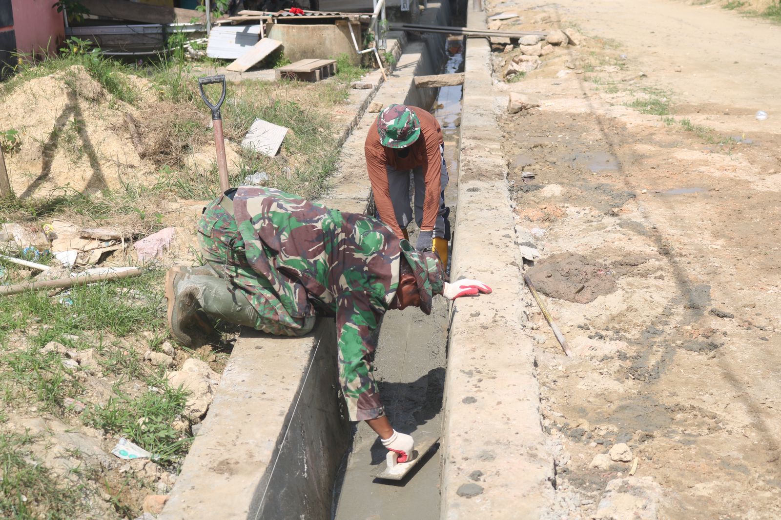 Pada Senin (9/3), sejumlah personel terlihat bahu-membahu melakukan proses plasteran dinding saluran air atau drainase.