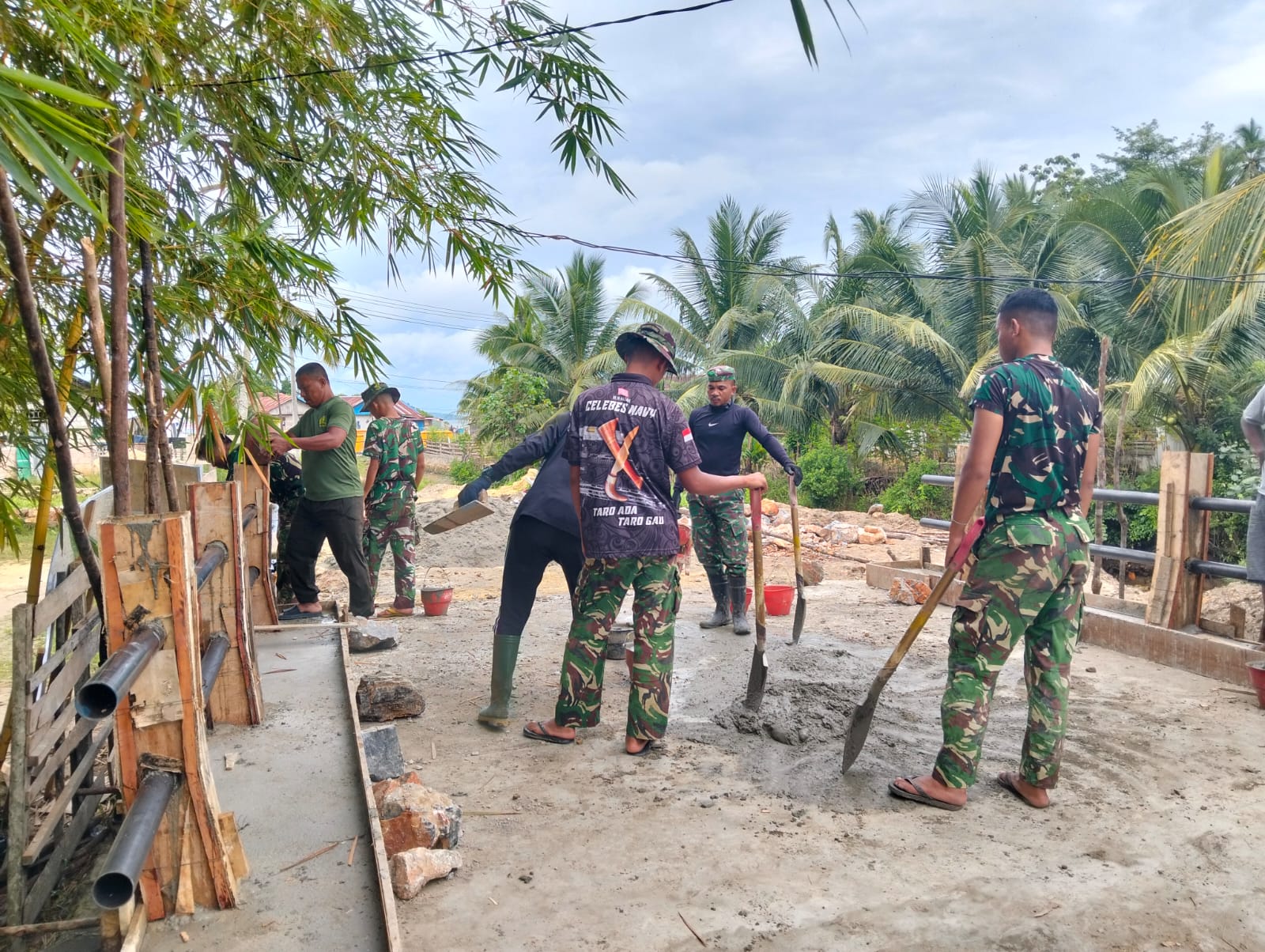 Dengan penuh semangat, para prajurit bersama masyarakat setempat bahu-membahu menyiapkan material semen dan melakukan pengecoran secara teliti guna memastikan struktur pengaman jembatan memiliki daya tahan yang maksimal.