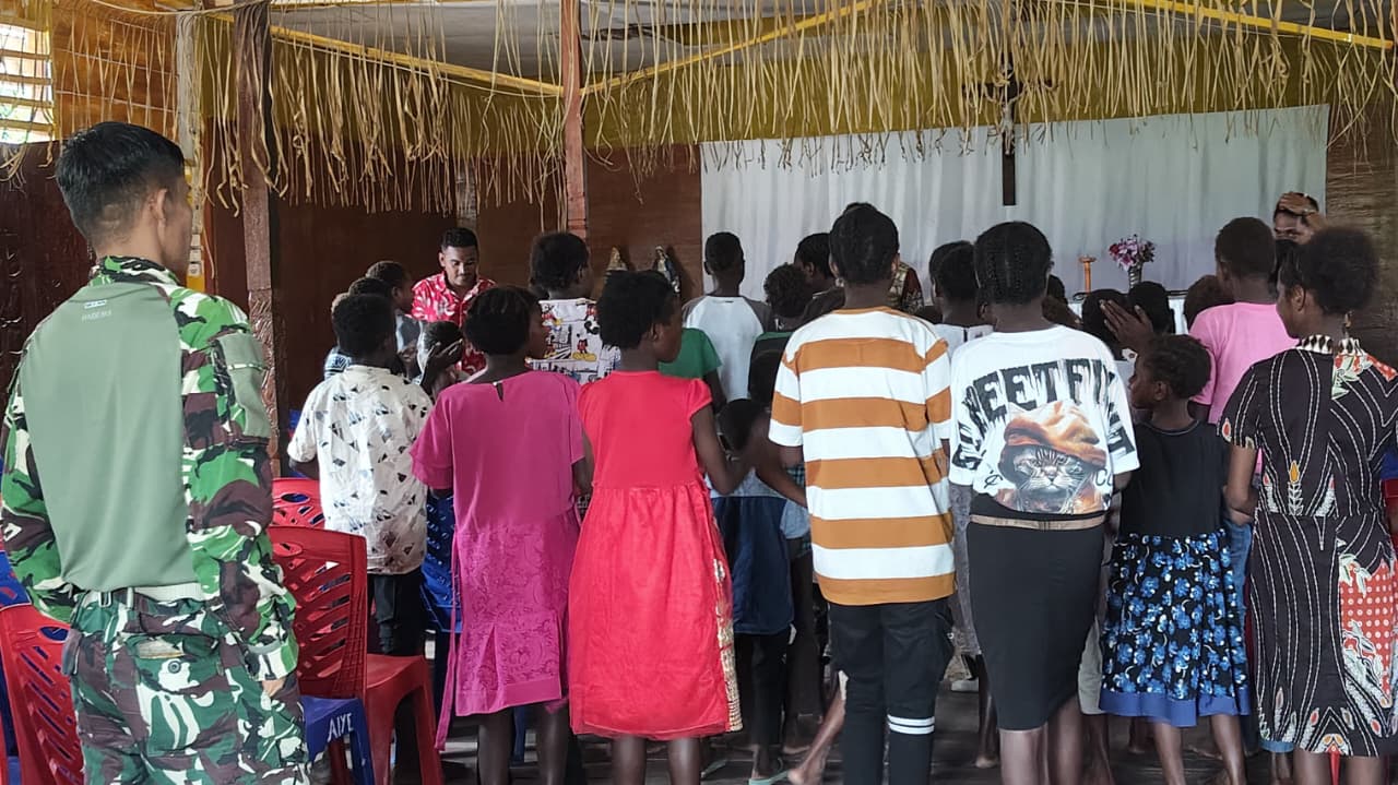 TIMIKA – Di sela-sela pelaksanaan program TNI Manunggal Membangun Desa (TMMD) Reguler ke-128 Kodim 1710/Mimika, personel Satgas TMMD melaksanakan ibadah bersama masyarakat di Kampung Keakwa, Distrik Mimika Tengah, Minggu (26/4/2026). Kegiatan ini menjadi wujud nyata kedekatan antara TNI dan warga dalam membangun kebersamaan serta memperkuat hubungan emosional di tengah pelaksanaan program TMMD.