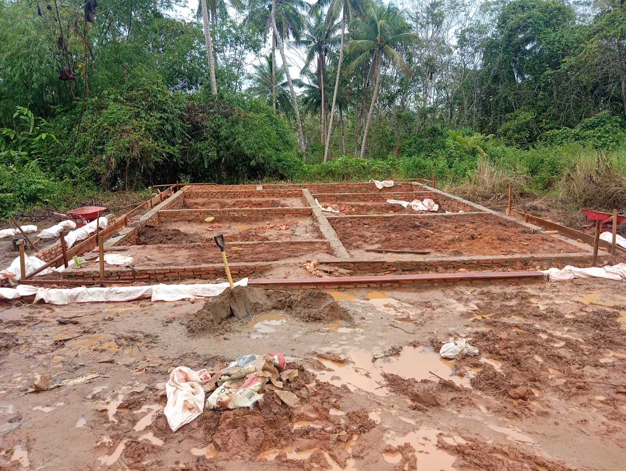 Meskipun kondisi lapangan masih lembap dengan bekas genangan air akibat hujan yang turun pada pagi dan siang hari, pekerjaan penimbunan tanah serta penataan bata merah untuk pondasi telah berhasil dilaksanakan. Area kerja menunjukkan bahwa rangkaian pondasi telah disusun sesuai dengan desain yang telah ditetapkan, dengan beberapa bagian telah ditutupi kain untuk melindungi material dari cuaca. Alat kerja seperti sekop juga telah disiapkan di lokasi untuk mendukung kelancaran pekerjaan.