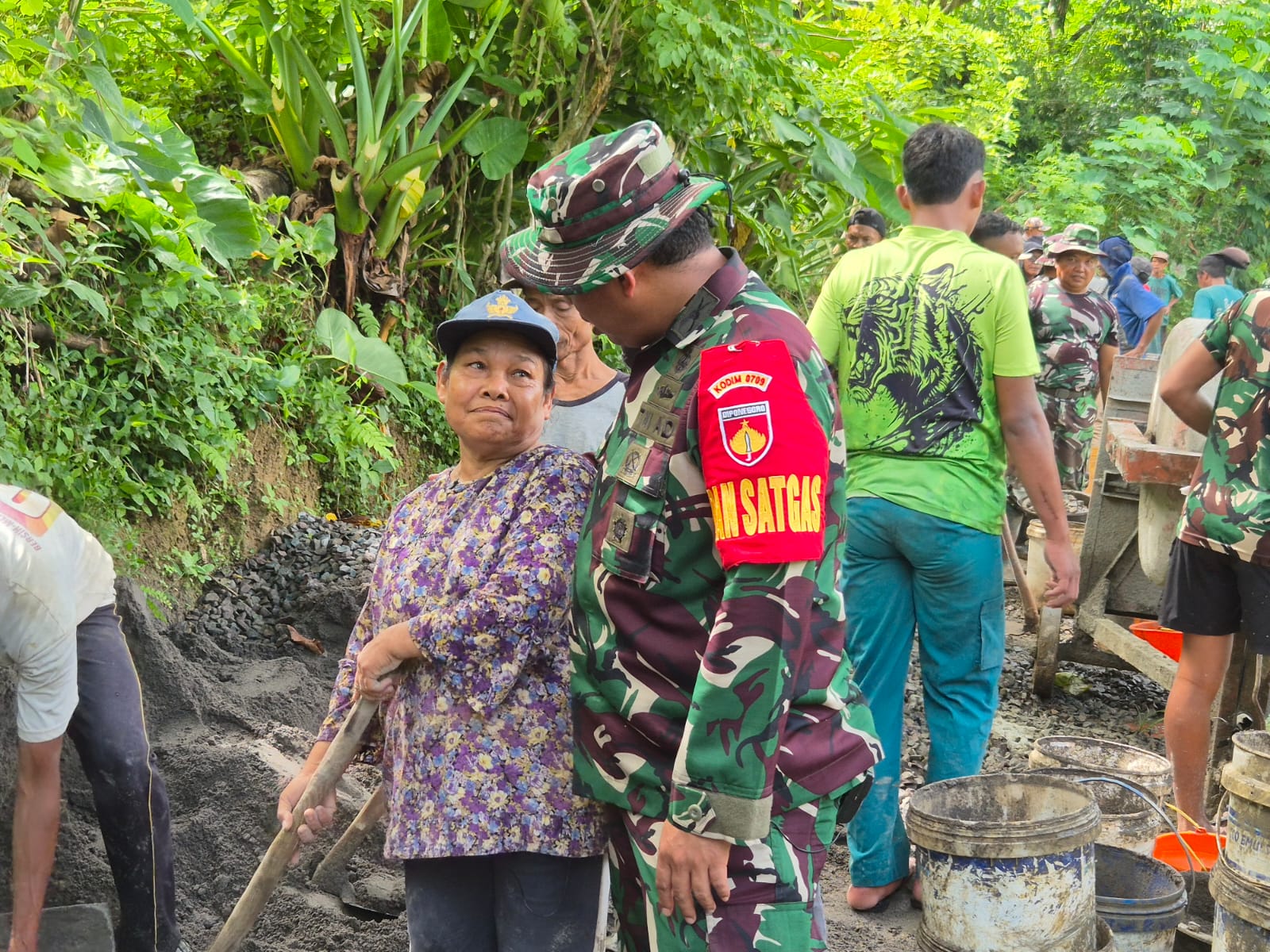 Komandan Kodim 0709/Kebumen, Letkol Inf Eko Majlistyawan Prihantono S.H., M.I.P., turun langsung ke lapangan menyapa para prajurit Satgas TMMD dan masyarakat yang sedang berjibaku mengaduk semen dan meratakan beton demi terwujudnya jalan impian warga desa.