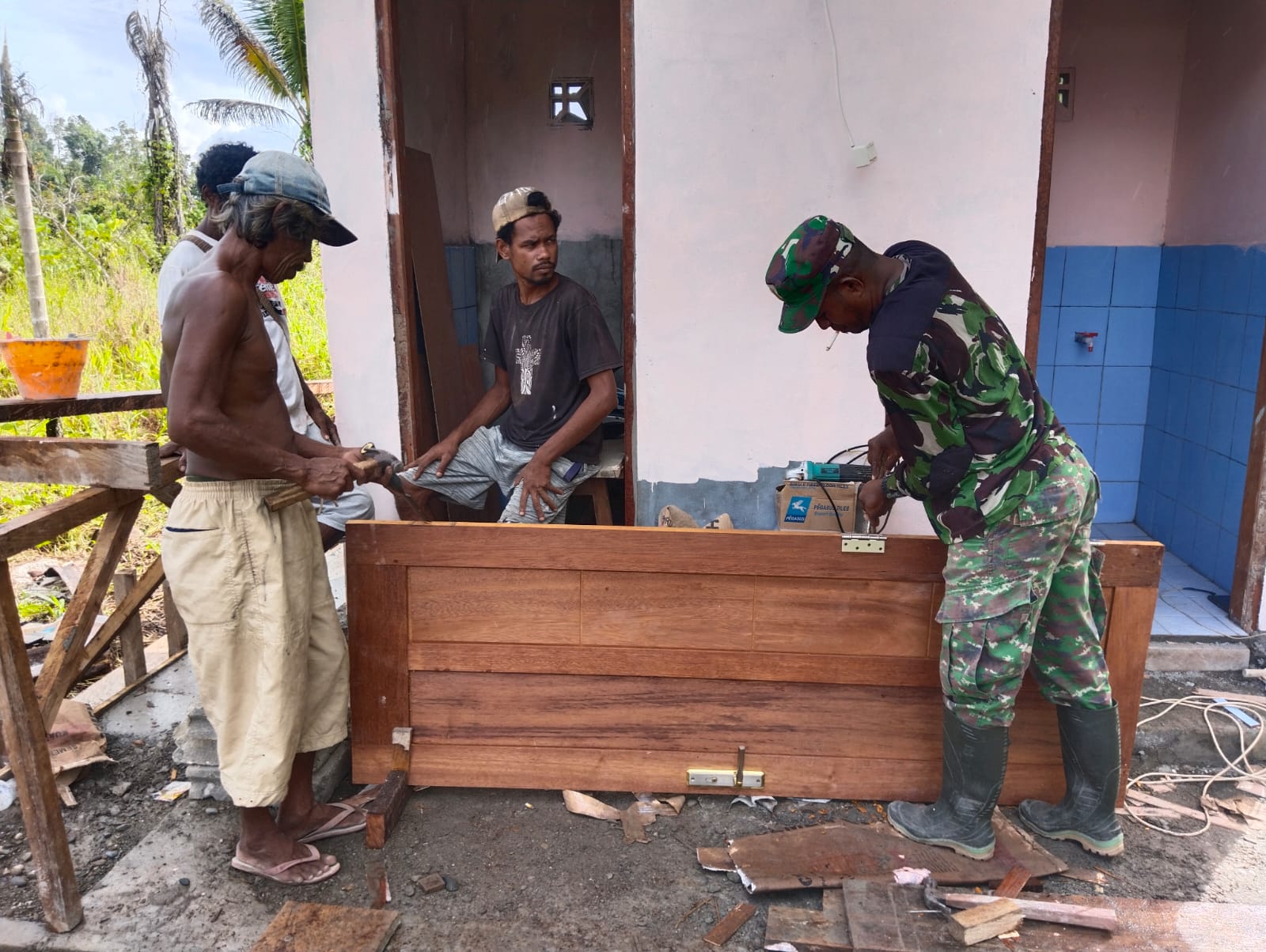 MIMIKA – Pembangunan fasilitas Mandi, Cuci, dan Kakus (MCK), yang menjadi salah satu dari beberapa sasaran fisik program TNI Manunggal Membangun Desa (TMMD) Ke-124 Kodim 1710/Mimika, terus berlanjut. Saat ini, Satgas TMMD bersama warga Kampung Iwaka tengah fokus pada tahap pemasangan pintu MCK, Senin (26/05/2025).