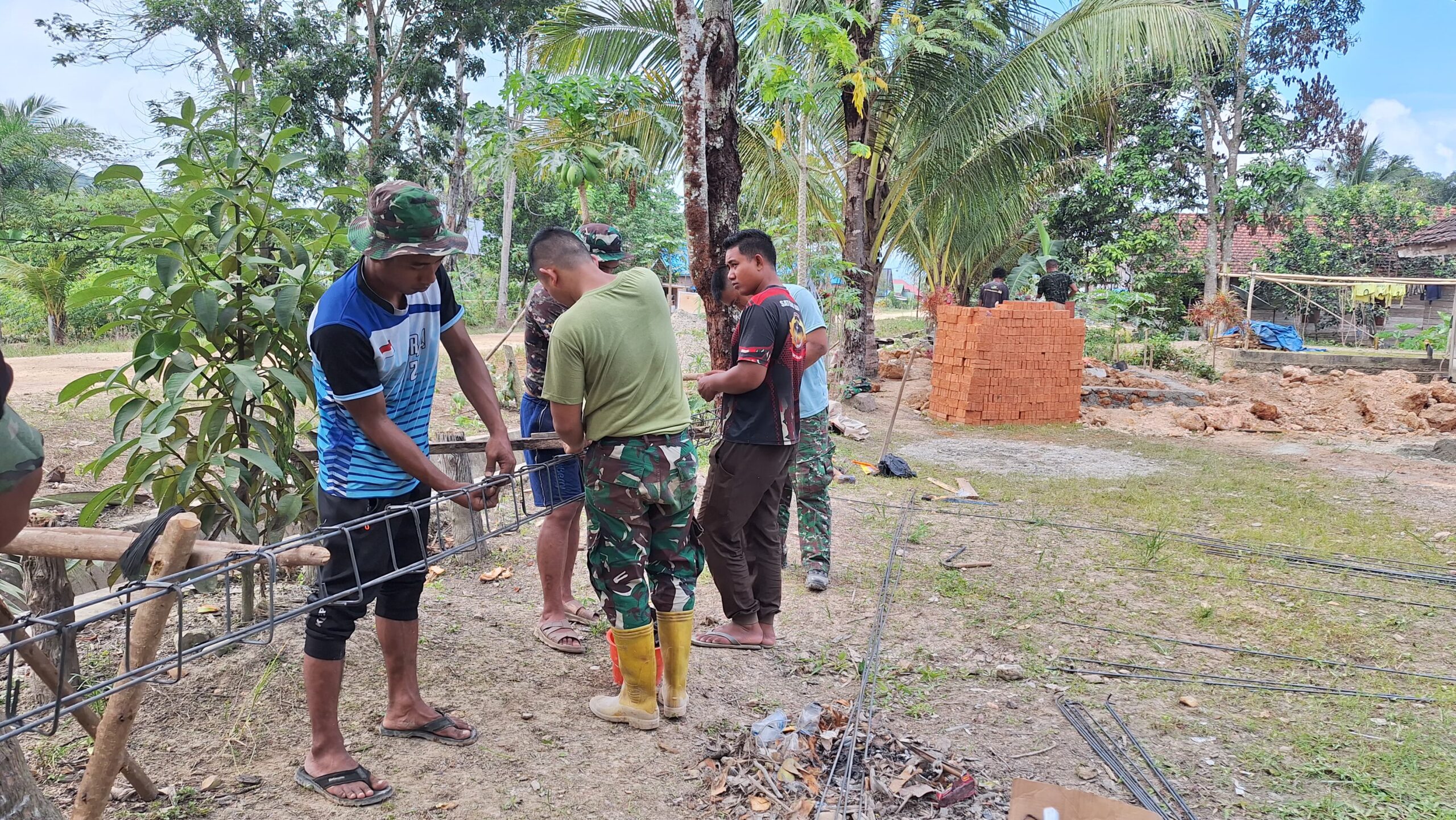 Konawe – Satgas TNI Manunggal Membangun Desa (TMMD) ke 125 Kodim 1417/Kendari bersama warga kembali melanjutkan pekerjaan rangkai besi cor untuk pengecoran, bertempat di Desa Nekudu, Kec. Asinua, Kab. Konawe, Selasa (5/8). Pekerjaan merangkai besi tersebut membentuk suasana yang harmonis antara TNI dan masyarakat dalam mendukung program TMMD 125 di kecamatan Asinua.