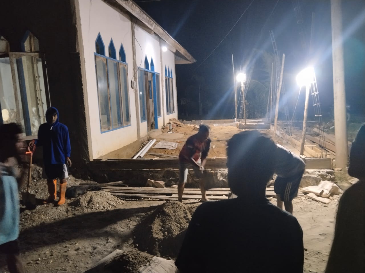 Meski memasuki malam hari, anggota Satgas TMMD bersama masyarakat terus kompak dalam mengejar progres pembangunan MCK dan halaman Masjid.