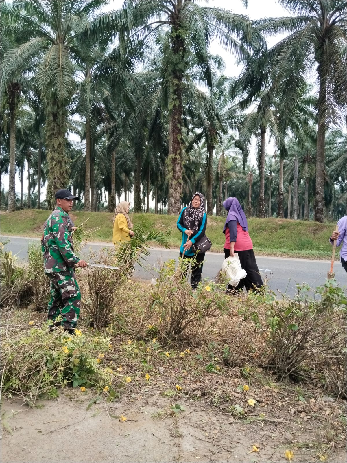 Kegiatan ini melibatkan anggota Satgas TMMD bersama warga setempat yang bahu-membahu membersihkan semak belukar dan sampah di sepanjang jalan. Dengan peralatan sederhana seperti parang dan alat kebersihan lainnya, mereka bekerja sama menciptakan lingkungan yang lebih bersih dan nyaman.