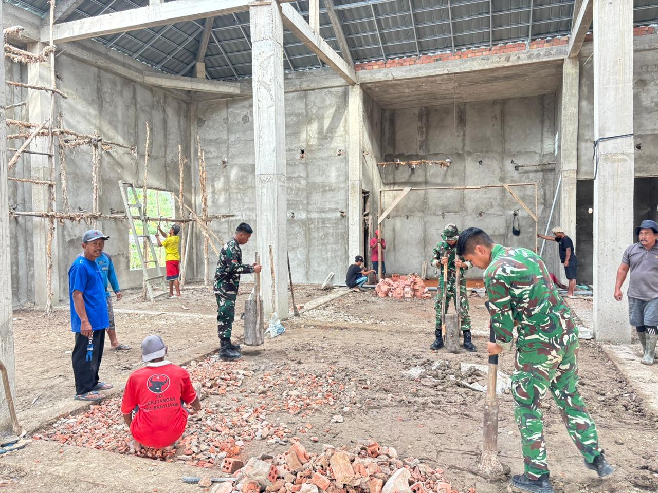 BANYUASIN – Anggota Satuan Tugas (Satgas) TNI Manunggal Membangun Desa (TMMD) ke-127 bersama masyarakat Desa Wonosari terus bergotong royong melanjutkan pembangunan Masjid Jami Darusalam di Desa Wonosari, Kecamatan Pulau Rimau, Kabupaten Banyuasin.