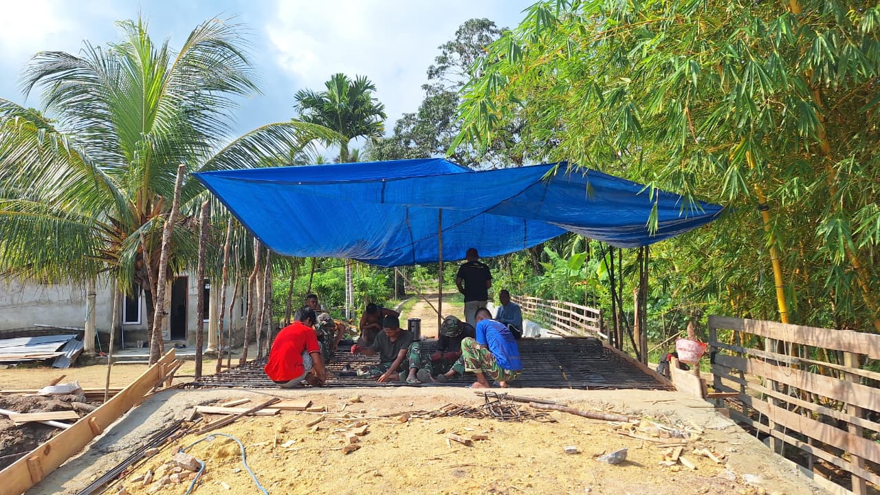 Mereka bahu-membahu merangkai struktur besi tulang jembatan dengan penuh ketelitian. Kehadiran personel TNI di tengah masyarakat ini bukan sekadar pengerjaan fisik, melainkan simbol kuatnya kemanunggalan TNI dengan rakyat dalam membangun infrastruktur desa.