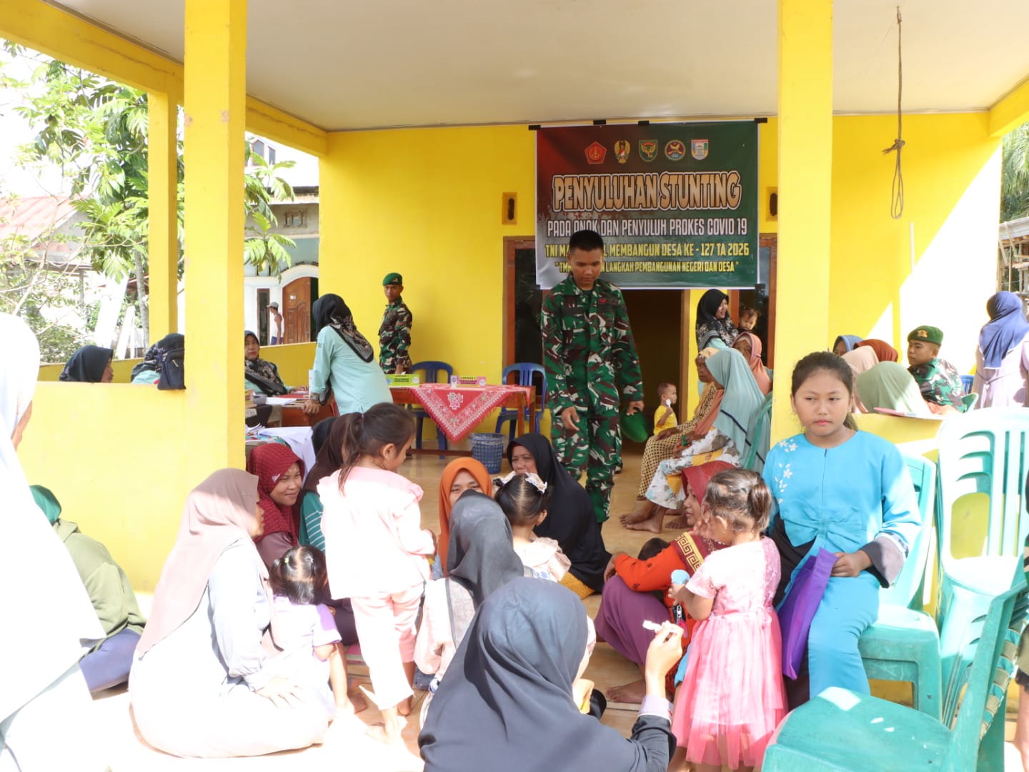 BANYUASIN – Sebagai bagian dari program nonfisik TNI Manunggal Membangun Desa (TMMD) ke-127, anggota Satuan Tugas (Satgas) TMMD 127 Kodim 0430/Banyuasin (BA) melaksanakan penyuluhan mengenai stunting pada anak dan protokol kesehatan (prokes) Covid-19 kepada masyarakat Desa Wonosari. Kegiatan ini bertujuan untuk meningkatkan pemahaman masyarakat mengenai pentingnya pencegahan stunting dan penerapan prokes Covid-19 dalam kehidupan sehari-hari.