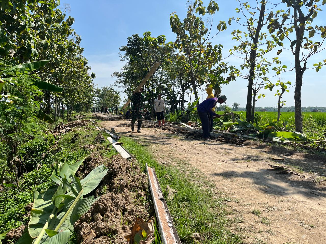 SRAGEN – Walupun hari Minggu tidak menjadi halangan bagi Satgas TMMD, demi mengejar target fisik TMMD Reguler ke-128 Kodim 0725/Sragen, Satgas TMMD bersama warga mulai melangsir besi Begesting dan memasang papan besi bekisting untuk program pengecoran jalan Desa Puro, Kecamatan Karang malang, Kabupaten Sragen, Pada hari Minggu (26/04/2026)