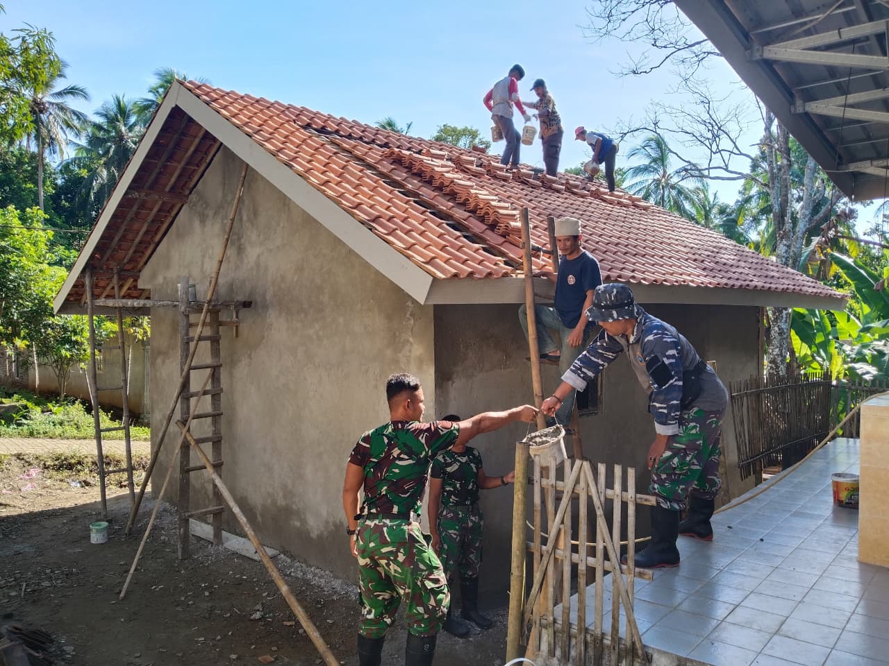 Selain itu, beberapa personel terlihat membantu dari bawah dengan menyiapkan bahan bangunan, sementara yang lain bekerja di atas atap untuk mempercepat penyelesaian pekerjaan. Kekompakan dan gotong royong antara TNI dan masyarakat menjadi gambaran nyata dari semangat kebersamaan yang selalu dikedepankan dalam setiap kegiatan TMMD.