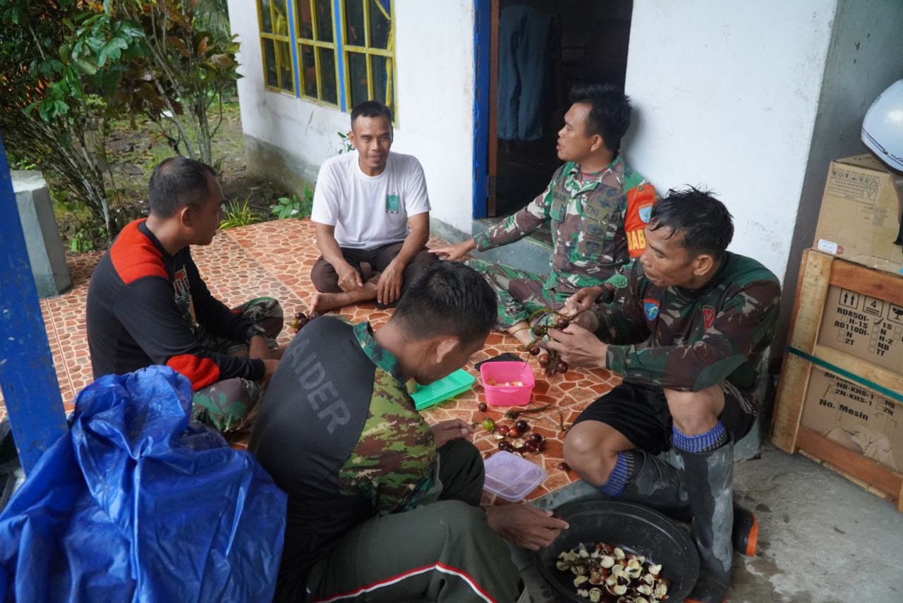 Sambas – Di sela-sela kesibukan melaksanakan berbagai pembangunan fisik dalam program TNI Manunggal Membangun Desa (TMMD) Reguler ke-126, personel Satgas TMMD Kodim 1208/Sambas tetap meluangkan waktu untuk melaksanakan komunikasi sosial (komsos) bersama warga di lokasi kegiatan, 18 Oktober 2025.