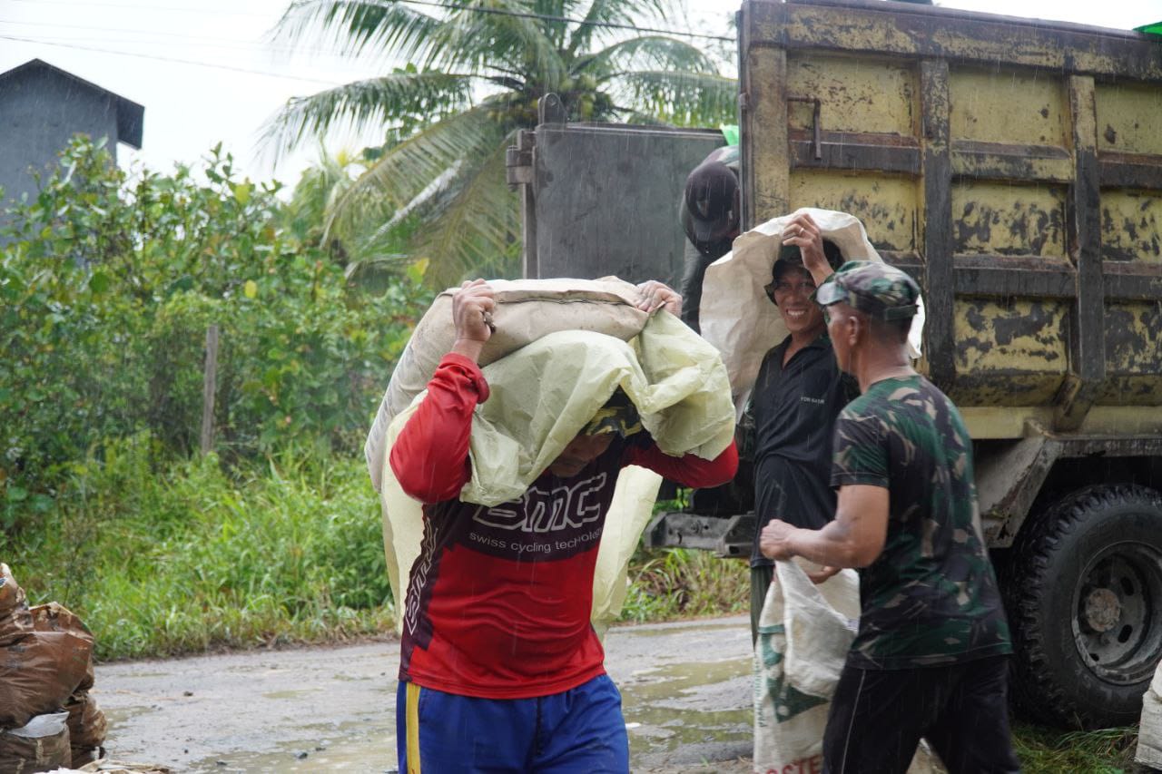 Meski kondisi cuaca sempat tidak menentu, hal itu tidak menyurutkan semangat anggota Satgas TMMD untuk tetap bekerja maksimal. Dengan cara memanggul semen secara manual, para prajurit memastikan bahan bangunan dapat segera sampai di titik pengerjaan rabat beton dan sasaran fisik lainnya.