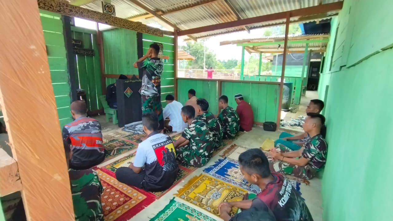 Dalam suasana khidmat, prajurit TNI terlihat duduk rapi di atas sajadah, mengikuti rangkaian ibadah Sholat Jumat. Momen ini menjadi wujud nyata dari upaya menjaga keseimbangan antara tugas negara di lapangan dan kebutuhan spiritual.