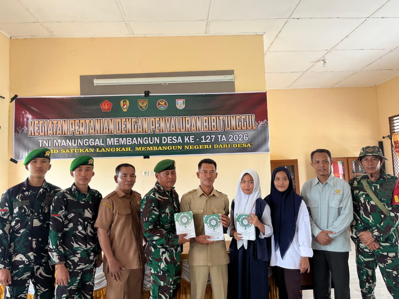 Banyuasin– Anggota Satgas TMMD ke-127 dari Kodim 0430/Banyuasin melaksanakan kegiatan pembagian Al-Qur’an kepada masyarakat Desa Wonosari, Kecamatan Pulau Rimau, Kabupaten Banyuasin. Kegiatan ini merupakan bagian dari sasaran nonfisik program TMMD yang bertujuan memperkuat pembinaan mental dan spiritual masyarakat desa.