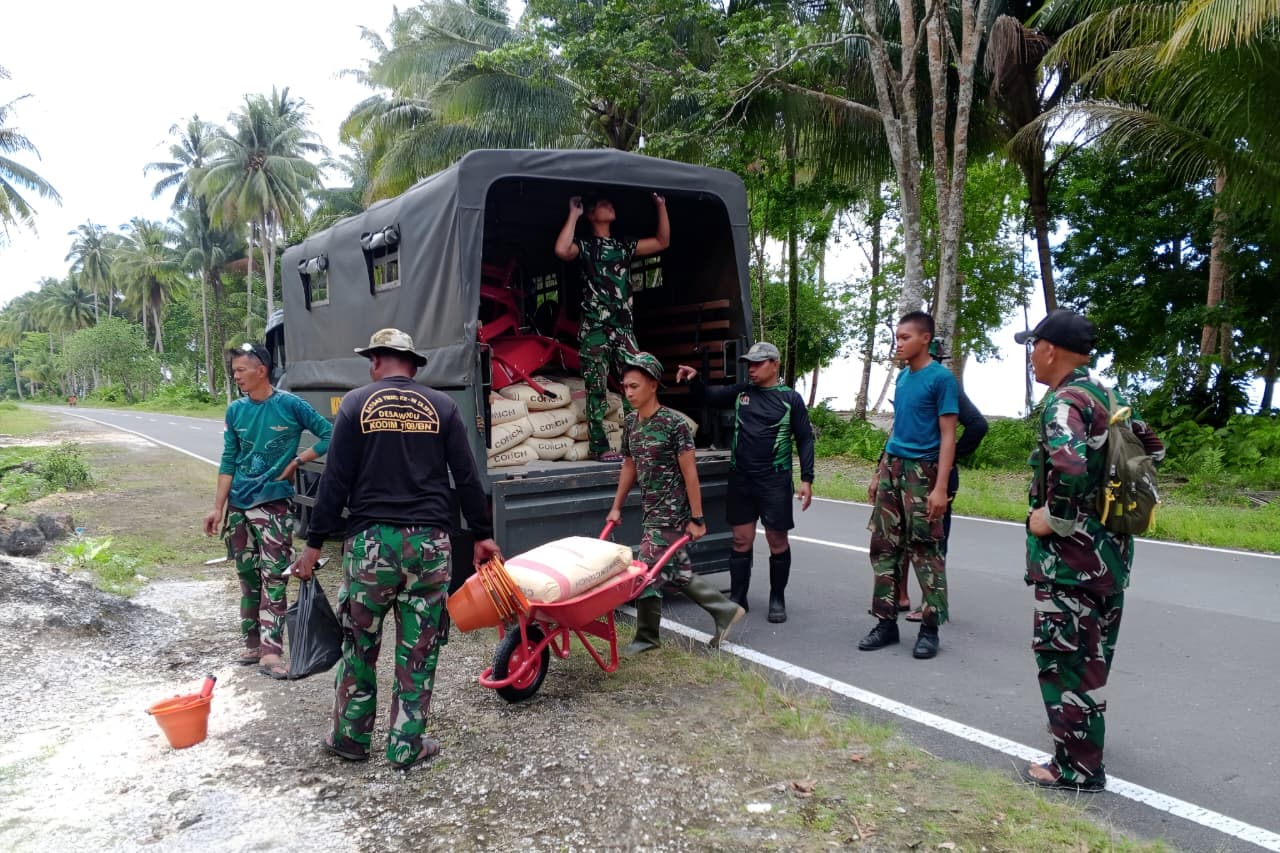 Para prajurit tampak bekerja dengan penuh tanggung jawab dan gotong royong saat memindahkan material dari kendaraan pengangkut menuju lokasi proyek. Kehadiran personel TMMD di lokasi tidak hanya bertujuan untuk memperlancar distribusi logistik, tetapi juga untuk memastikan bahwa seluruh bahan bangunan tersedia tepat waktu sehingga proses pembangunan dapat berjalan maksimal tanpa hambatan.