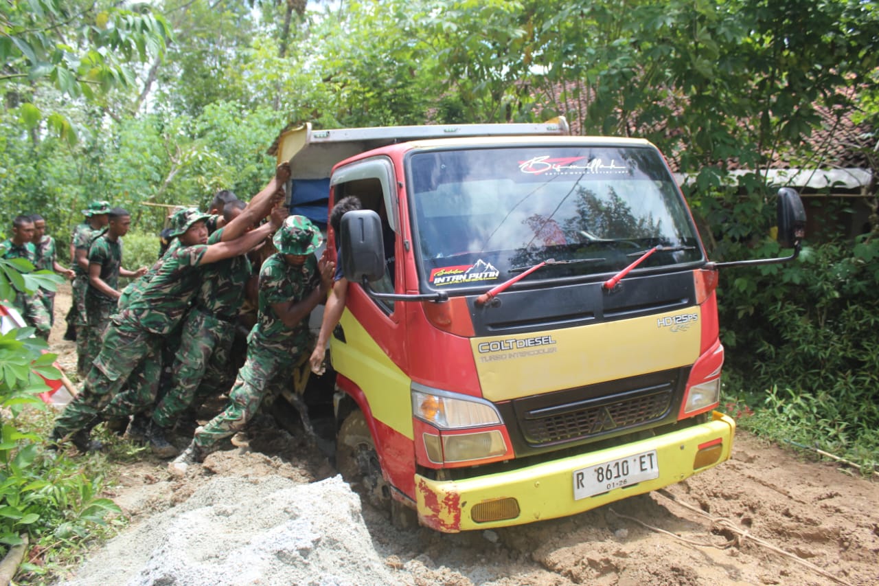 Medan yang berat akibat tanah basah dan berlumpur membuat kendaraan pengangkut material kesulitan melintas. Tanpa ragu, para prajurit bersama warga turun tangan mendorong truk tersebut agar dapat kembali bergerak membawa material yang sangat dibutuhkan untuk pengerjaan sasaran fisik TMMD.