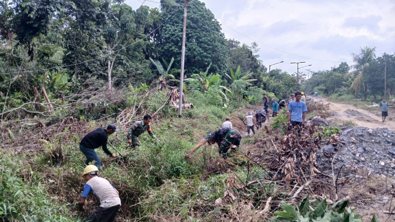 Sambas – Anggota Satgas TNI Manunggal Membangun Desa (TMMD) Reguler Perbatasan ke-126 Kodim 1208/Sambas terus melanjutkan kegiatan fisik di lokasi sasaran. Kali ini, Satgas bersama warga bergotong royong membersihkan area di sekitar jalan yang telah dilakukan penimbunan, Senin (13/10/2025).