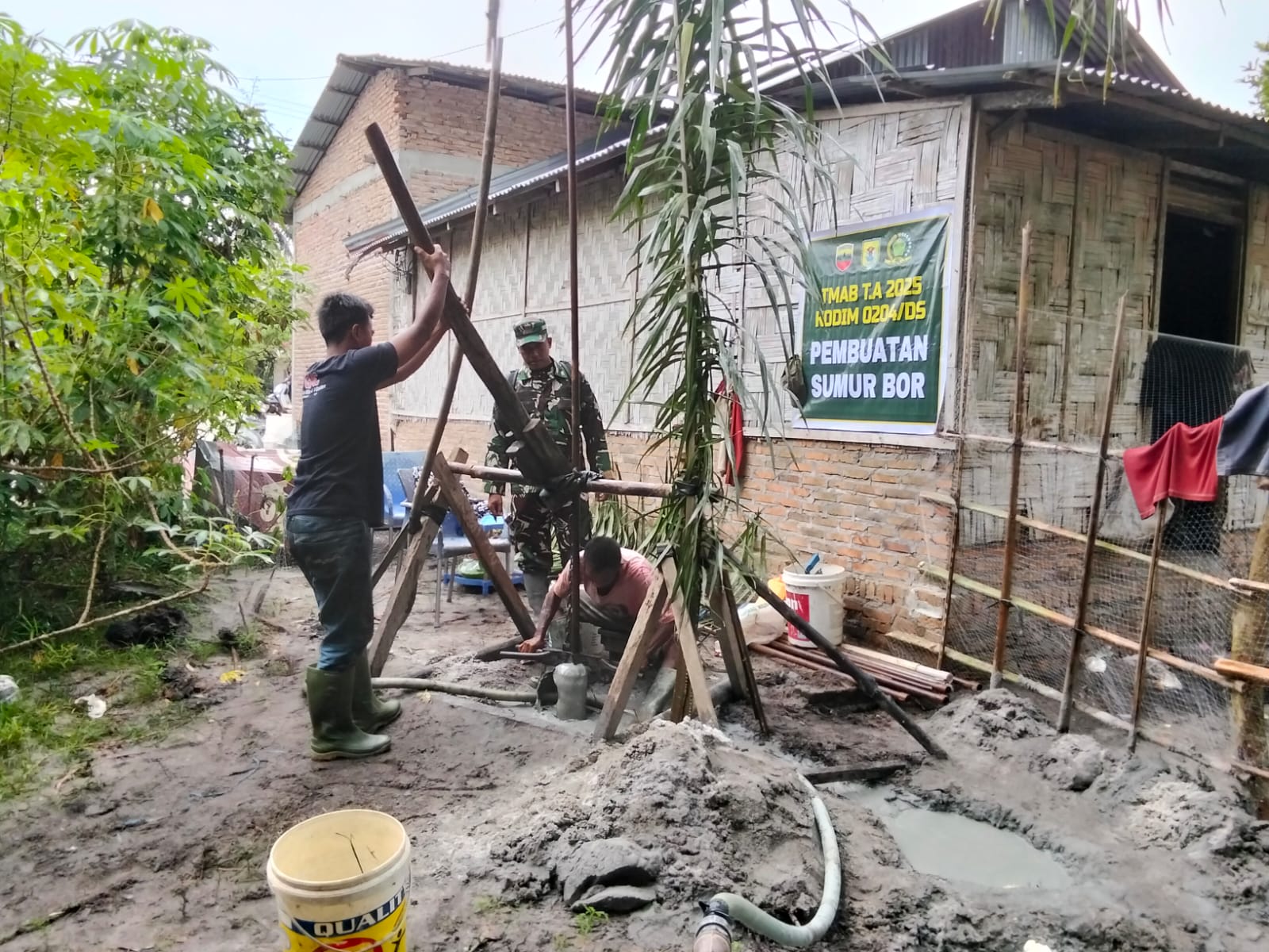 Dalam pantauan di lokasi, terlihat beberapa anggota Satgas TMMD bergotong royong mengangkat dan menekan tiang bor, sementara prajurit lainnya mengawasi proses pengeboran yang sedang berlangsung. Papan informasi TMMD yang terpampang di dinding rumah warga menegaskan kegiatan ini sebagai bagian dari upaya Kodim 0204/DS untuk mengatasi kesulitan air bersih.